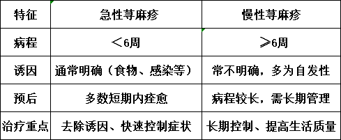 急性荨麻疹:病程<6周,常由明确诱因(如食物、感染)引起,起病急骤,但通常短期内可痊愈。