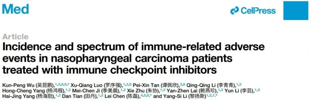 近日,我院肿瘤科吴昆鹏、罗序强与谭佩欣(省医)作为共同第一作者的学术论文,成功发表于国际知名期刊《Med》。论文题目为《Incidence and spectrum of immune-related adverse events in nasopharyngeal carcinoma patients treated with immune checkpoint inhibitors》(《免疫检查点抑制剂治疗鼻咽癌患者的免疫相关不良反应发生率及发生谱分析》),该研究成果为临床精准管理鼻咽癌免疫治疗相关不良反应提供了高质量循证依据,填补了该领域安全性数据的空白。
