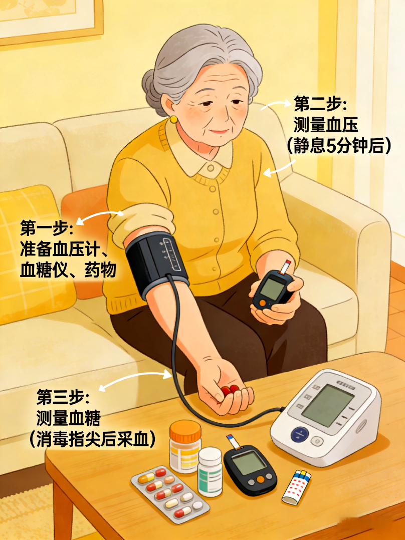 规律监测,做好记录:每天固定时间监测血糖、血压(糖尿病患者建议空腹+餐后2小时测血糖,高血压患者早晚各测一次血压),做好记录,若发现指标持续异常(如血压>160/100mmHg、血糖空腹>10.0mmol/L),及时采取措施并就医。