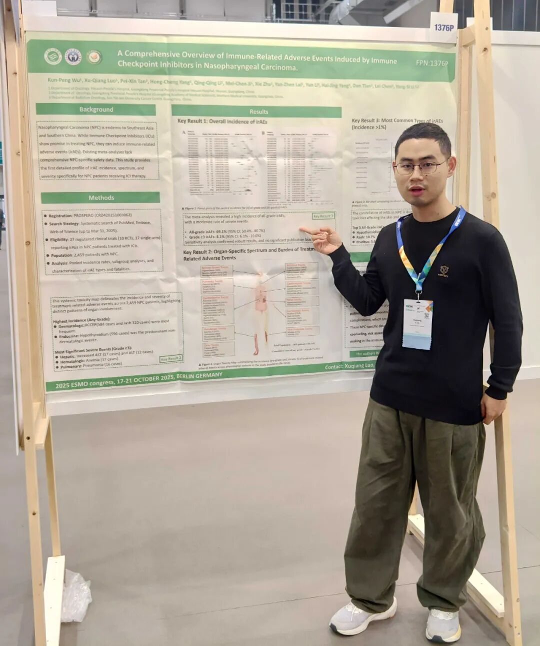 继去年研究成果亮相欧洲肿瘤内科学亚洲年会(ESMO-Aisa)后,今年科室团队再攀新高峰——研究成果《疫检查点抑制剂在鼻咽癌中引发的免疫相关不良事件综合概述》(A Comprehensive Overview of Immune-Related Adverse Events Induced by Immune Checkpoint Inhibitors in Nasopharyngeal Carcinoma),在2025ESMO年会以海报展示(Poster Presentation)的形式在大会交流。肿瘤科罗序强医师作为该项研究的共同第一作者,代表团队赴会进行展示与交流。本次入选的研究精准聚焦鼻咽癌免疫治疗中的关键临床难点“免疫治疗相关不良事件管理”,该研究为提升免疫治疗的安全性、改善患者生存质量提供了重要临床指导,具有切实的临床应用价值。