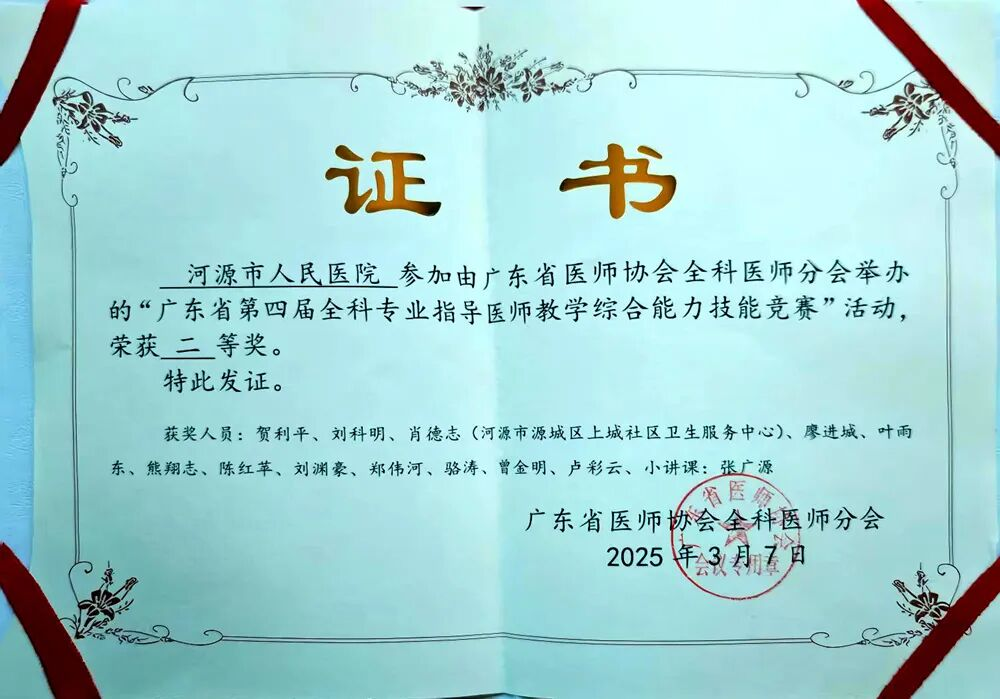 ▲“广东省第四届全科专业指导医师教学综合能力竞赛” 二等奖