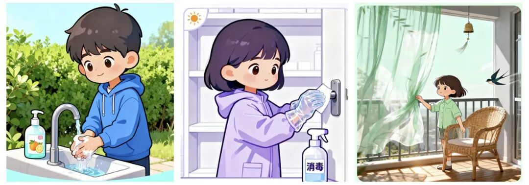 ③环境消毒:每天定时对门把手、桌面、地面等公共区域进行清洁消毒。使用含氯消毒剂(按说明书稀释)或75%酒精。宝宝房间保持每日通风2-3次,每次不少于30分钟。