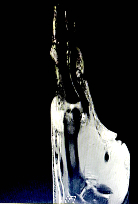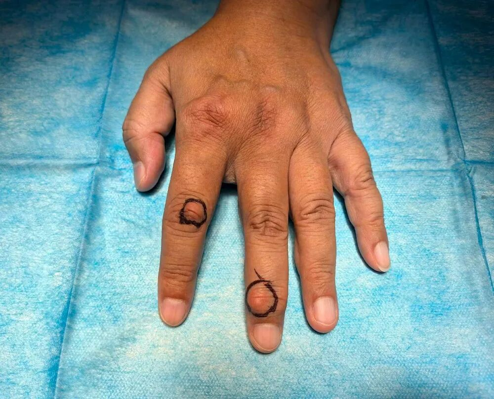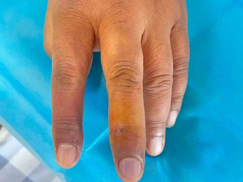 从国外回国的钱先生专程前往我院就诊,风湿免疫科学科带头人谢悦胜了解到该患者长期反复出现双足、双膝及肘关节疼痛,血尿酸数值常年持续高于 500μmol/L 且居高不下;其并非未曾用药,而是存在服药不规律的问题,常常症状缓解后便自行停药,认为无痛感即无需继续治疗,长此以往尿酸盐结晶在体内大量沉积堆积,最终在左手及左肘关节形成痛风石。患者患处常有隐痛不适且关节活动明显受限卡顿,核磁共振检查结果显示尿酸盐结晶已侵蚀至指骨边缘,若不及时干预将造成不可逆的关节损伤,单纯依靠口服降尿酸药物溶解结晶的速度,远无法跟上痛风对骨关节的破坏进程,因此医生建议通过手术方式清除痛风石。