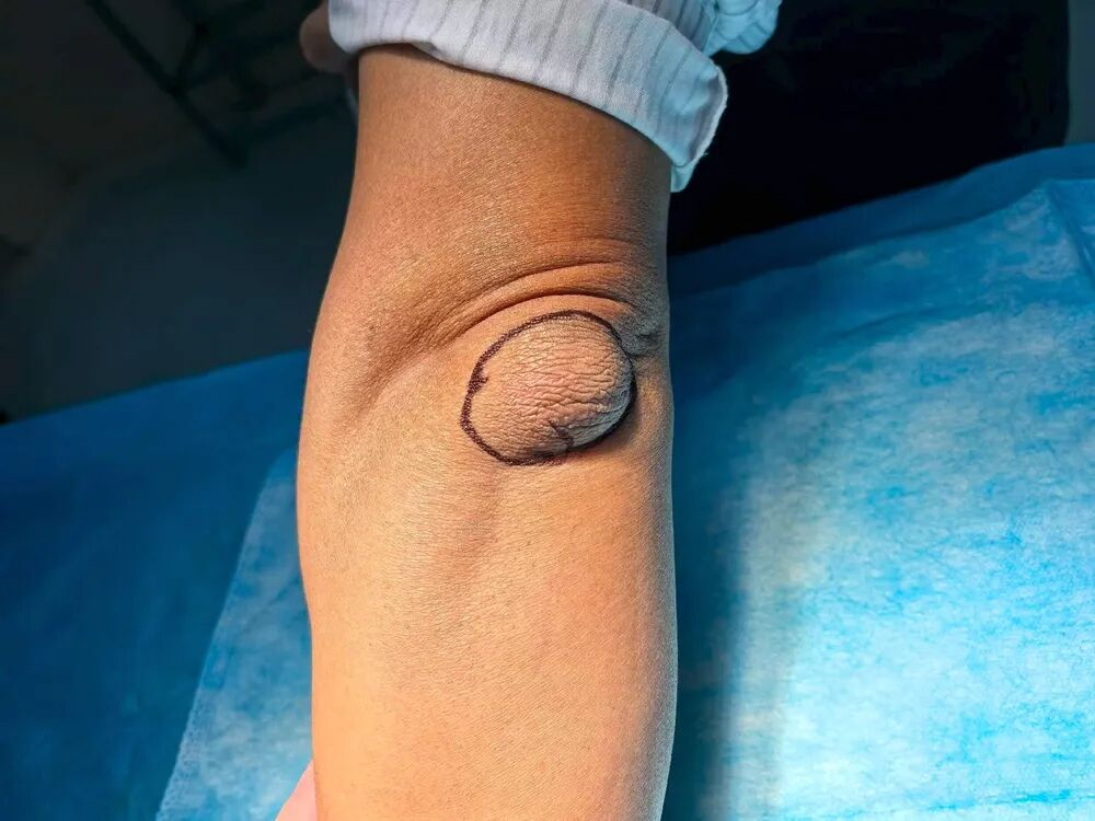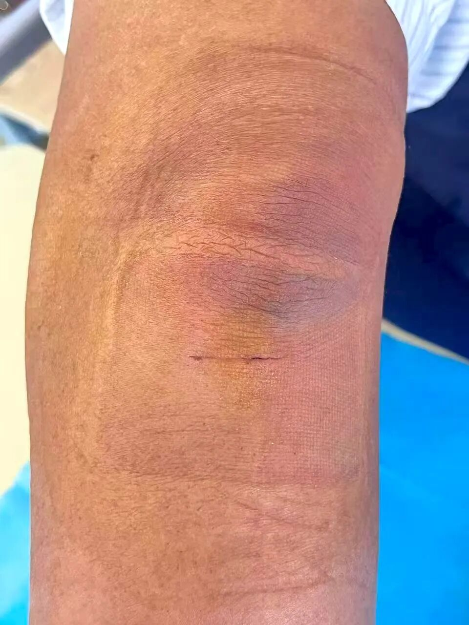在风湿免疫科学科带头人谢悦胜及陈波主任的指导下,医疗团队评估确认该患者符合痛风石清除手术各项指征:无手术禁忌症、痛风性关节炎非急性发作期、关节无红肿疼痛且手术区域皮肤无感染病灶,可有效规避术后感染及痛风急性发作风险,术前还为患者规范使用口服药物进行降尿酸预处理;结合影像科辅助检查结果可见,患者体内痛风石大小约 26mm×17mm,周边邻近骨质已出现吸收与破坏改变,若拖延至关节严重损毁、皮肤破溃流脓后再实施手术,即便完成痛风石清除,受损的关节功能也大概率无法恢复。