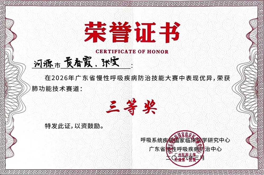 近日,由呼吸系统疾病国家临床医学研究中心、广东省慢性呼吸疾病防治中心联合主办的“粤呼吸·竞未来”——2026年广东省慢性呼吸疾病防治技能大赛在广州圆满落幕。作为河源市慢性呼吸疾病防治中心挂靠单位,我院积极组织骨干力量参赛,呼吸与危重症医学科张雯、赖惠玲两位同志凭借扎实的理论功底和规范的操作能力,在激烈角逐中脱颖而出,分别荣获肺功能技术赛道个人三等奖和护理技术赛道个人优秀奖,充分展现了我院在慢性呼吸系统疾病防治领域的专业实力与精神风貌。