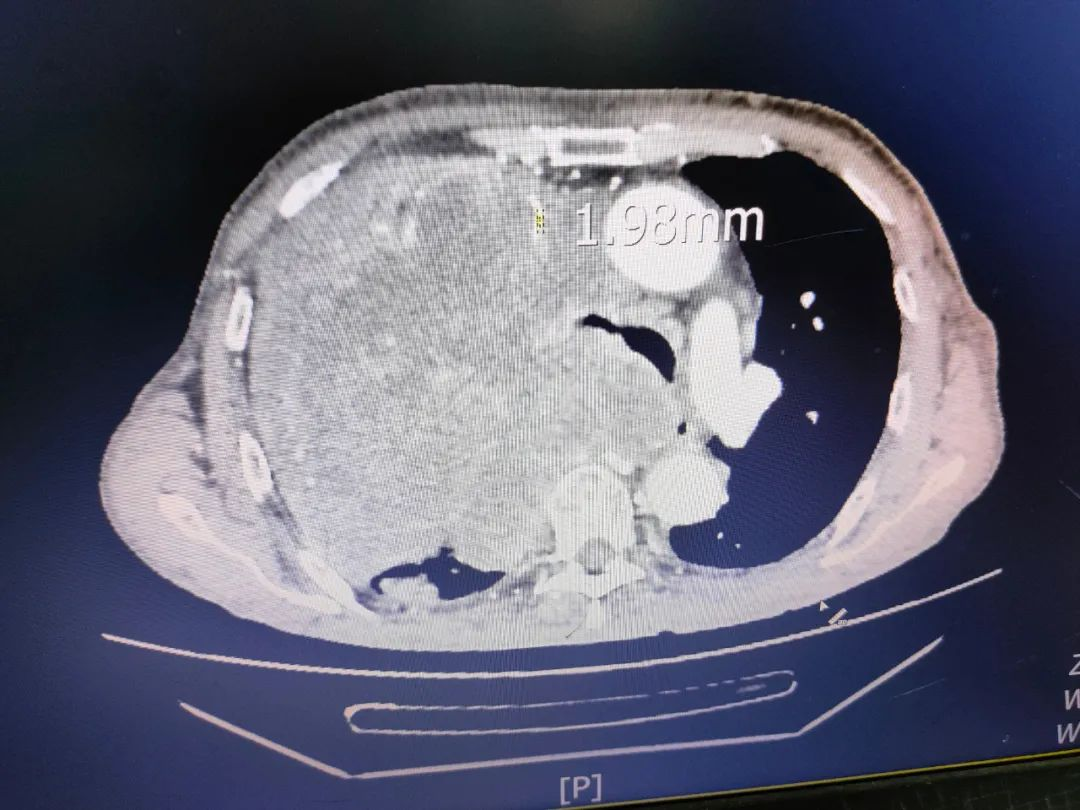 病例介绍:患者胡某某,诊断右肺上叶中央型肺癌并多发转移。确定治疗方案后,呼吸与危重症医学科学科带头人罗少华主任首先想到的就是让静疗专家会诊,为患者选择安全的静疗通路。李柳英副主任了解了患者病情,查看CT片,左上肺肿瘤的大小为152mm×141mm×167mm(前后×左右×上下径),最大直径占满左胸腔,上腔静脉严重压迫,上腔静脉最小管径1.99mm,患者出现上腔静脉压迫综合征,上腔静脉压迫综合征是上肢PICC置管、输液的绝对禁忌症,经与管床医生充分讨论后,决定经患者下肢置入PICC进行治疗。