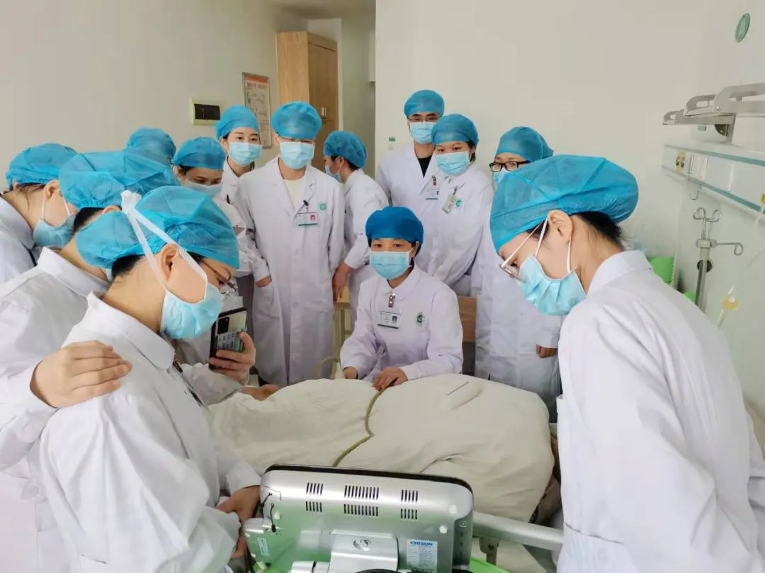 置管现场:李柳英副主任示范穿刺点消毒,指导肿瘤科二区护士长魏雪玲置管,李柳英副主任从下肢置管部位选择、B超定位、测量长度、消毒、穿刺、置入导管、宣教指导等逐一解说,结合上肢置管的区别提醒注意事项,整个过程患者平静配合未诉不适,下床行走自如,操作顺利完成,包括罗少华主任在内20余名医护人员现场观摩并交流,大家都被身边的省医护理专家所鼓舞,求知欲望强烈,期待下一次的静疗实践。