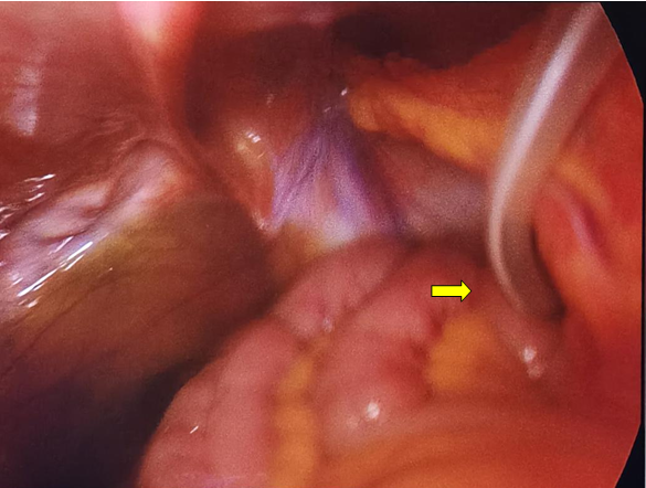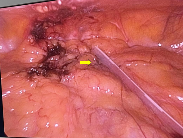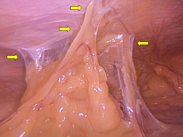 大网膜与腹壁及盆腔入口广泛粘连(黄色箭头所指为黏连部位)