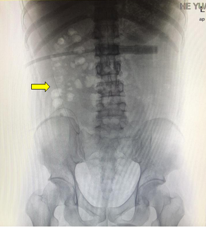 X光片显示腹膜透析导管移位至右侧中腹部(黄色箭头所指为移位的腹膜透析导管尖端,位于右侧中腹部)
