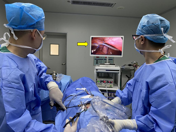当天,患者全麻下接受腹腔镜手术,普通外科吴乾龙主治医师主刀,肾内科谢剑腾主任带领肾内科团队联合手术。术中建立人工气腹、在脐上切开1.5cm切口置入腹腔镜进行腹腔内探查,见患者下腹部大网膜与腹壁(原妇科手术切口下方)及盆腔入口广泛黏连,遂在传统开腹腹膜透析置管术口部位切开1.5cm切口置入Trocar(腹腔镜穿刺器)、放置操作钳,仔细分离腹壁及盆腔黏连的大网膜组织,去除腹腔内复杂因素后,由腹腔镜Trocar置入腹膜透析导管,在腹腔镜引导下将导管末端送至腹腔内理想位置,术中术后患者腹膜透析导管出入液顺畅,已进行术后恢复和居家腹膜透析治疗操作培训。