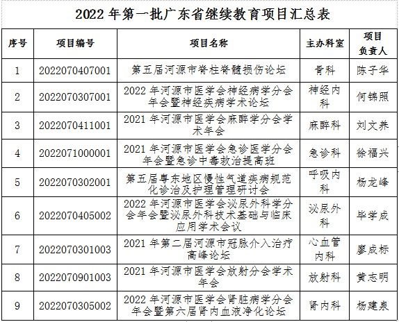 经广东省继续医学教育委员会(粤继医教〔2022〕2号)审核批准,我院申报的9个继续医学教育项目被列为“2022年第一批省级继续医学教育项目”,授予省级Ⅰ类学分。届时欢迎河源市广大医务工作者积极参加学术活动,共享学术盛宴。省级继续教育项目目录公布如下: