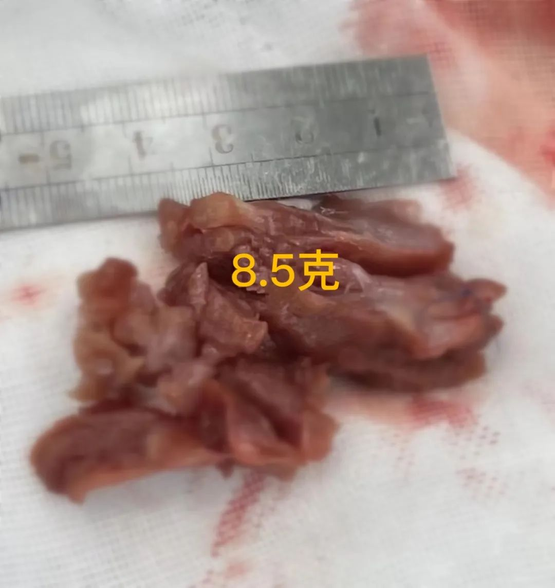 根据患者的病情,省医心脏外科郭惠明教授带领心脏外科专家团队与我院介入血管心脏外科、重症医学科、心血管内科、麻醉科、体外循环团队、手术室护理团队、超声医学科团队经过详细计划和周密的安排,成功为患者实施了经主动脉肥厚室间隔扩大切除、双侧肺静脉隔离、左心耳结扎术,术程顺利。术中精准切除了长4.5cm×宽3.5cm×厚1.2cm大小的室间隔心肌组织,总重量达8.5g。虽然切除的心肌组织仅仅8.5g,但根据术中食道超声的监测结果,术后患者左心室流出道压力差显著下降,二尖瓣重度返流消失,手术效果十分显著。术后,心脏外科、重症医学科详细评估患者病情,制定及调整后续治疗方案。在多学科及护理团队的共同努力下,患者病情得到缓解,复查各指标明显好转,于近日康复出院。