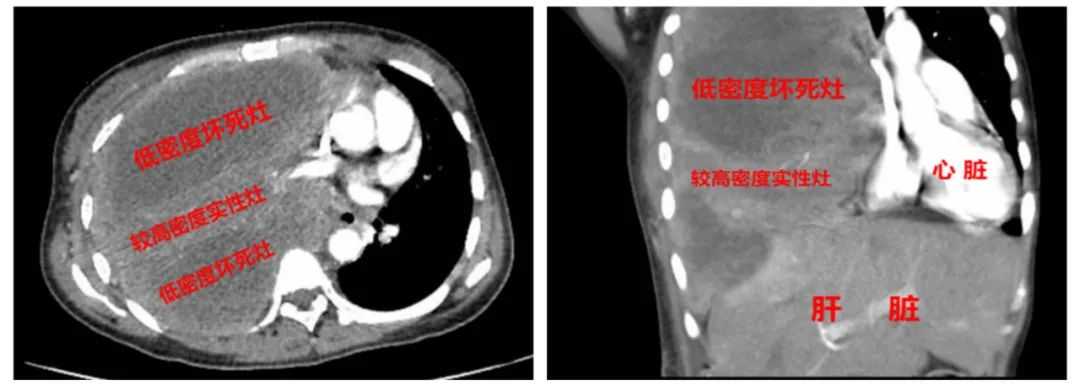 胸部CT示:巨大肿物占据整个右肺,大片低密度坏死灶。