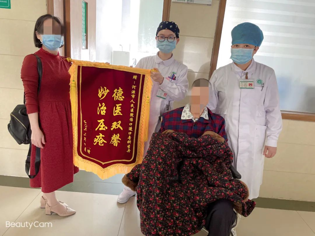 有一种情谊是在工作中形成,有一种感谢是发自内心的颂扬。近日,杨婆婆在家属的陪同下将一面印有“德医双馨、妙治压疮”的锦旗送到伤口造口护理专科小组工作人员的手中,以此感谢专科护士精湛的技术和无微不至的护理。