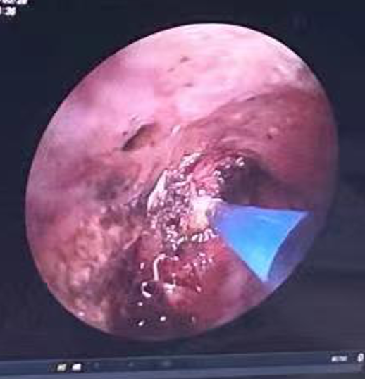 患者徐某,男,69岁,2019年5月在我院诊断为喉鳞状细胞癌,予手术治疗,2021年3月发现喉癌复发,行姑息手术,不同意化疗。此次因“咯血1月余”入院,胸部增强CT提示:气管下段、左主支气管壁增厚,考虑转移瘤;纵隔、左肺门多发肿大淋巴结并部分坏死,考虑转移。气管镜检查:1、气管下段至右主支气管开口新生物;2、左主支气管开口狭窄。活检病理示浸润性鳞状细胞癌。诊断为:喉鳞状细胞癌伴气管支气管转移瘤。罗少华主任查房后指出:患者此次出现咯血,主要是气管支气管转移瘤所致,可行支气管镜介入治疗,在支气管镜下进行支气管肿瘤冷冻切除+氩气刀消融治疗,以清除气道肿瘤,解除梗阻。