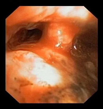 气管下段至左主支气管开口新生物完全遮盖隆突