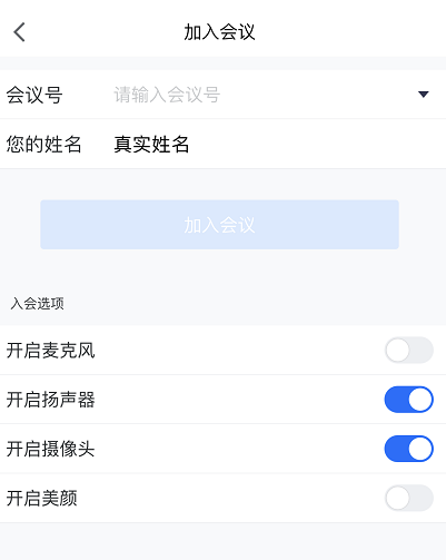 输入会议号,输入真实姓名,关闭麦克风、开启扬声器、开启摄像头、关闭美颜。