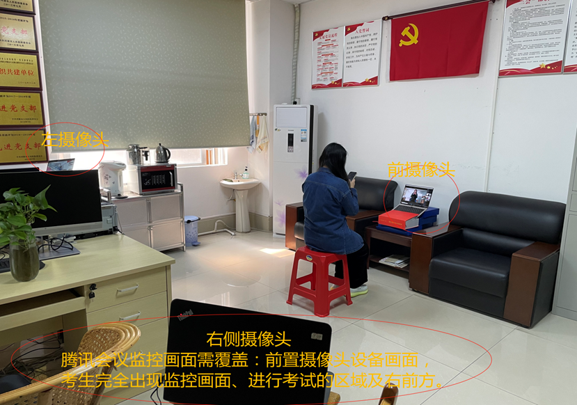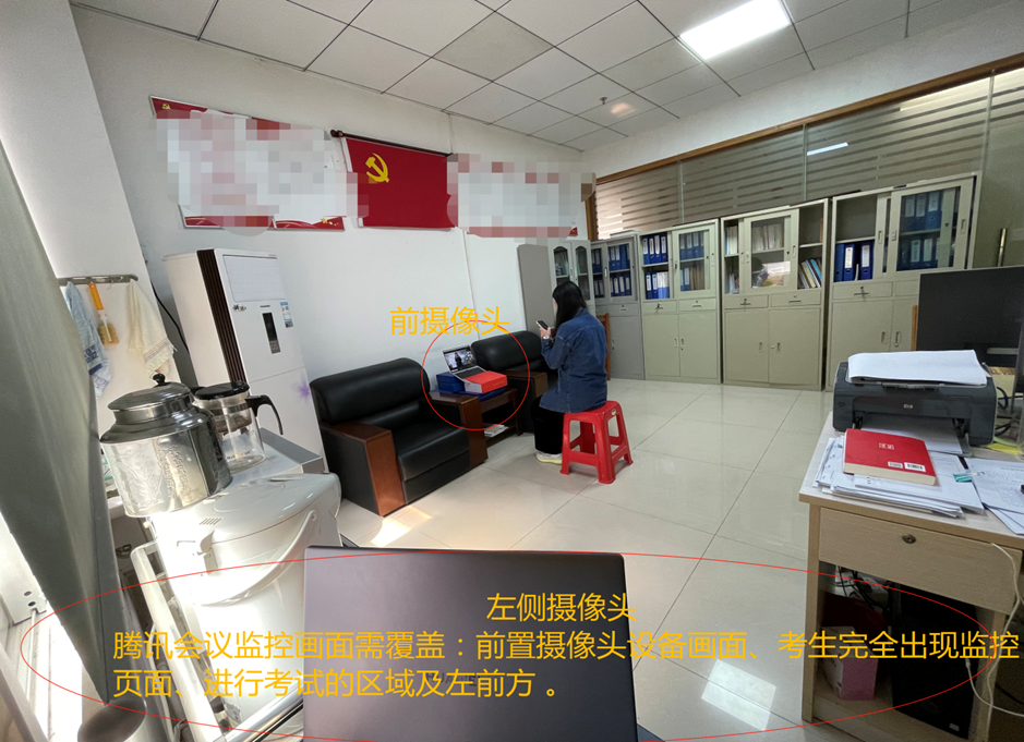 2.通过手机等其他设备进入指定的腾讯会议2并开启摄像头及关闭麦克风,设备需置于考生左后方,摄像头需覆盖考生及进行考试的区域及右前方。