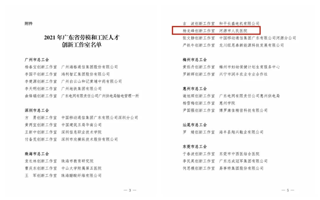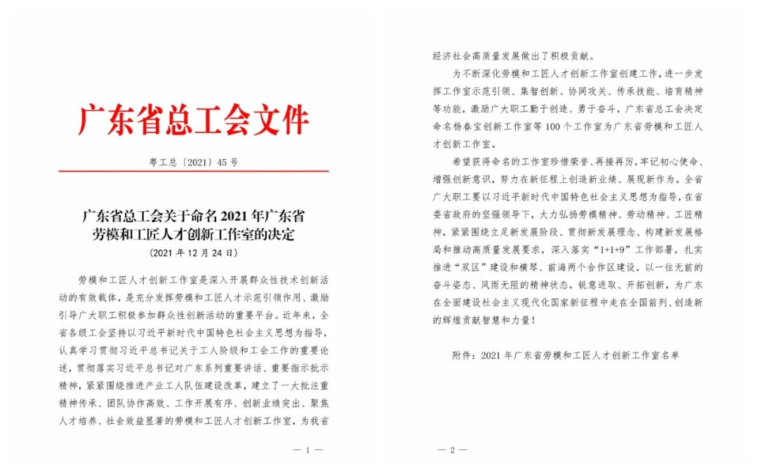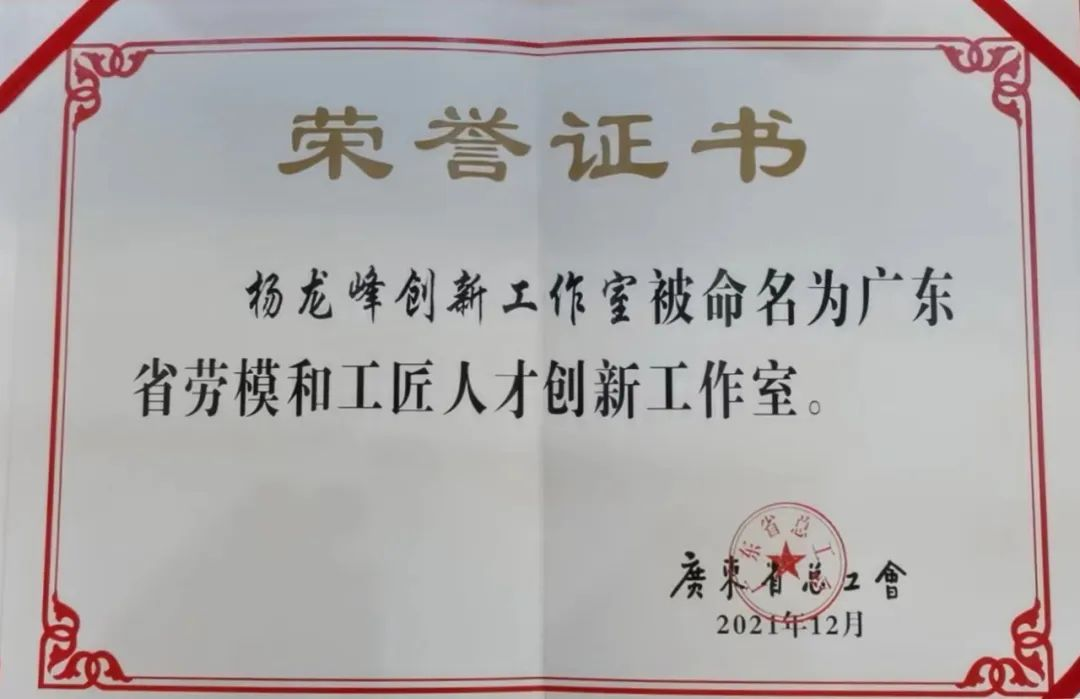 2021年12月,省总工会命名了100个广东省劳模和工匠人才创新工作室,我院杨龙峰创新工作室名列其中。