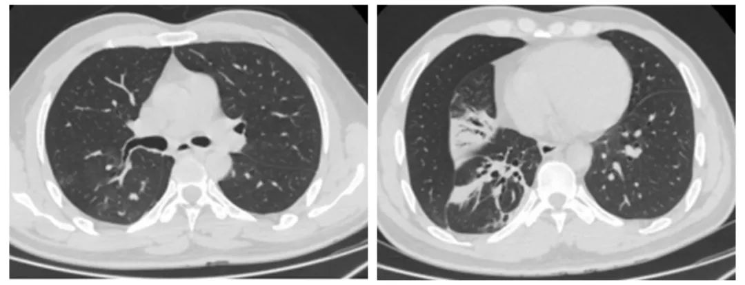 术后复查胸部CT示:右主支气管新生物清除,右下肺下叶较前明显复张