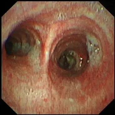 患者高某,男,45岁,因“咳嗽、咳痰5月”入院。胸部增强CT提示:1、右主支气管下段、右中间支气管占位性病变,并右肺下叶不张;2、双肺上叶、左肺下叶多发结节灶。影像学检查提示恶性肿瘤导致的阻塞性肺不张,但初步的病理活检并不支持,经气管镜组织活检提示:(右主支气管)黏膜慢性溃疡并肉芽肿形成。罗少华主任查房指出,患者为中青年男性,无吸烟史,右主支气管至右中间支气管占位,并右下叶肺不张,气管镜下活检病理未见肿瘤改变,可能跟取材表浅有关,但不完全排除非肿瘤性病变,建议行硬质支气管镜下支气管肿物钳除+激光消融术,取较大块组织行病理检查以明确诊断,同时,解除其气道梗阻。