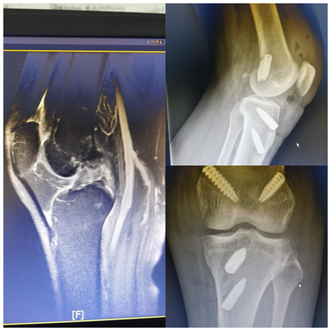 患者刘女士,因“外伤致全身多处疼痛8小时”入院。专科查体见:左下肢石膏托外固定牢固,左膝部轻度肿胀,左膝关节周围压痛,前后抽屉试验(+),Lachman试验(+),内外侧应力试验(-),麦氏征(-),浮髌试验(-),左膝关节活动受限,左足各趾活动、感觉、血运正常。