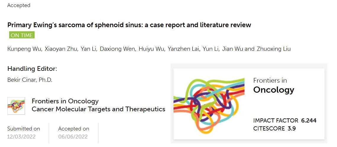 在征得患者同意后,吴昆鹏医生将该患者治疗过程及其他相关的病例报道进行汇总和分析,撰写病例报道及文献综述——《Primary Ewing’s sarcoma of sphenoid sinus: a case report and literature review》,经过半年的投稿修稿,近期成功被国际肿瘤学术期刊《Frontiers in Oncology》接收,该期刊最新因子为6.24分。该罕见病例成功救治的经验,为国内外该类疾病的诊治提供更多的临床资料参考,也为患者取得更好的疗效向前迈出一步。