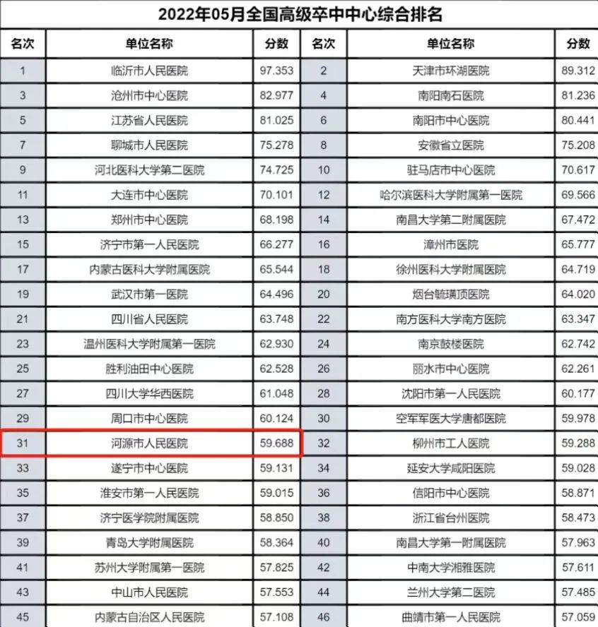 近日,国家卫生健康委员会脑卒中防治工程委员会发布2022年5月全国高级卒中中心综合排名, 河源市人民医院位居全省第2名、全国第31名,两项排名再创新高!