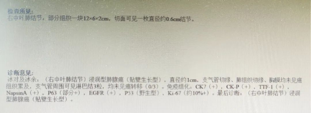 术后病理:右肺中叶浸润性肺腺癌