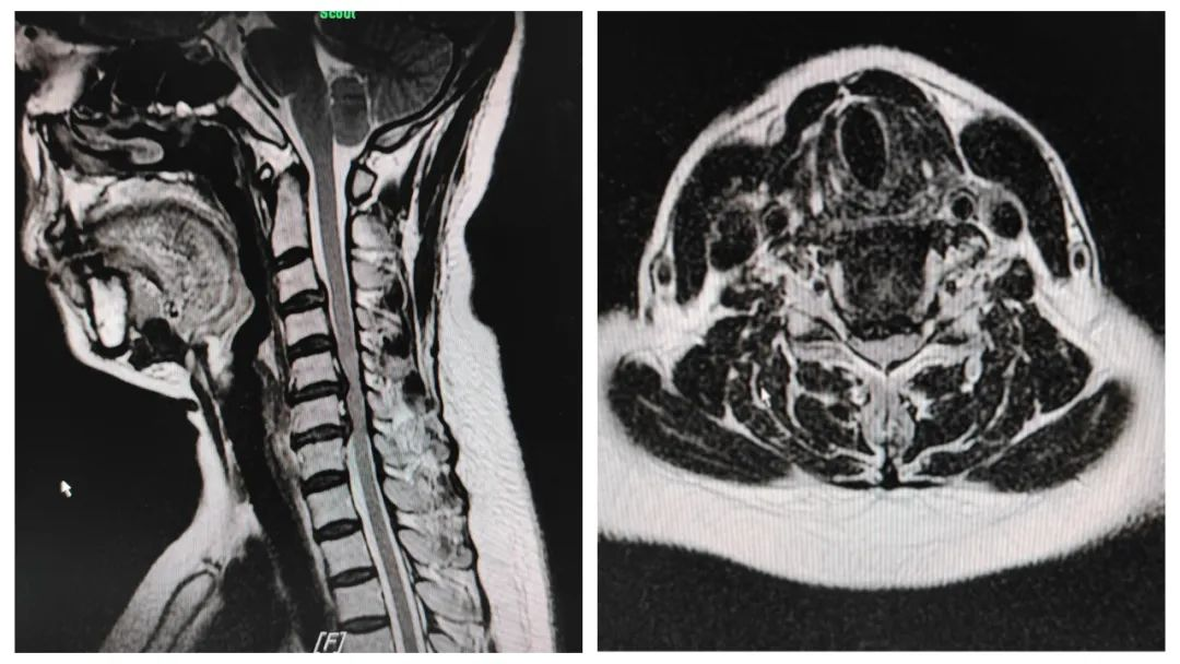 MRI显示颈4/5、5/6、6/7椎间盘突出