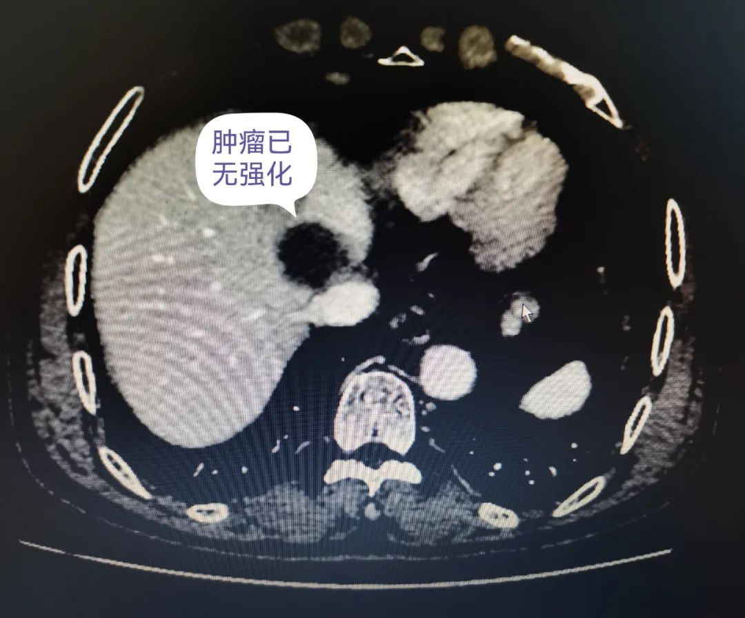 术后3周,患者复查腹部增强CT提示原第二肝门区肝细胞癌/肝中静脉癌栓及肝左叶子灶无强化,查甲胎蛋白5.4 ng/mL。目前患者继续定期免疫靶向治疗,定期复查随访。