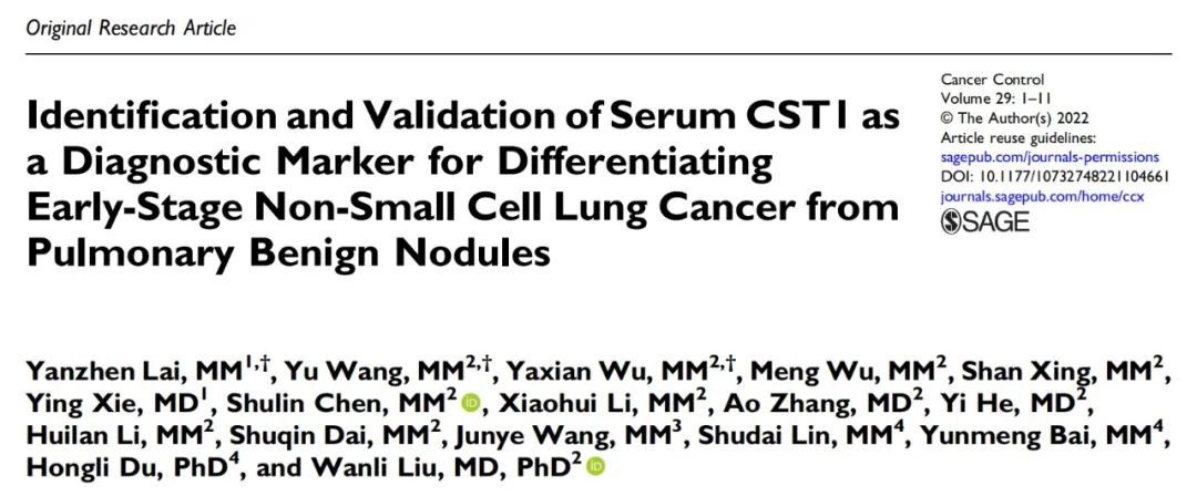 研究成果登上国际学术期刊,为肺癌早期鉴别带来希望在我院肿瘤科学术团队带领下,赖燕珍医师通过高通量测序方法在The Cancer Genome Atlas (TCGA) database 和 Gene Expression Omnibus (GEO) database 两大数据库中寻找早期非小细胞肺癌相关基因,在查阅既往32篇关于早期非小细胞肺癌的SCI论文研究中基础上筛序出可疑基因CST1。进一步通过分析正常人肺结节与早期非小细胞肺癌患者的血清、病理组织及细胞株,使用免疫组化、Western-blot(蛋白质印迹法)、ELISA(免疫酶联接免疫吸附剂测定)等方法从多个维度证实该基因的有效性,最后,以患者5年生存率作为评价指标,通过生存曲线分析CST1作为血清标记物的临床实用价值。在整个研究过程中,获得中山大学肿瘤医院刘万里教授团队的大力帮助。