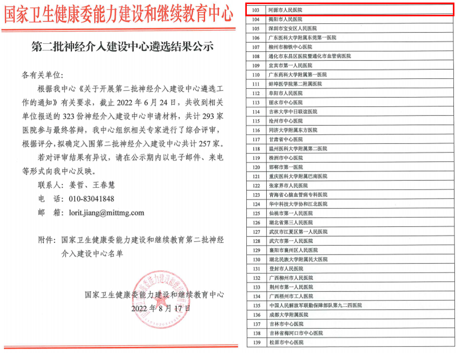 近日,国家卫生健康委能力建设和继续教育中心公布了全国第二批神经介入建设中心遴选结果,我院获批第二批全国神经介入建设中心。