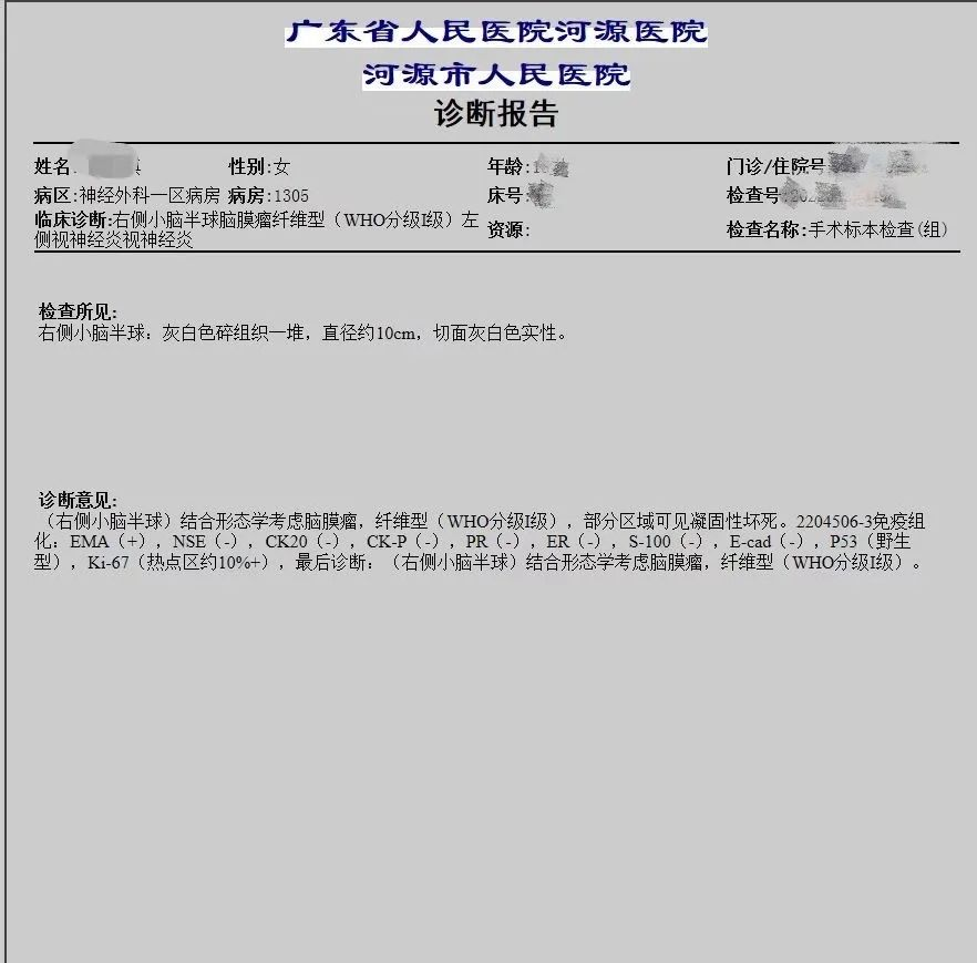 在广东省人民医院神经外科周东教授指导下,手术团队在完善所有术前准备后给患者精准实施手术,术中在显微镜辅助下先分离瘤周脑组织,给予脑棉片仔细保护,瘤内减压分块切除最终完整切除肿瘤,术后病理结果:为纤维型脑膜瘤(WHO1级)。