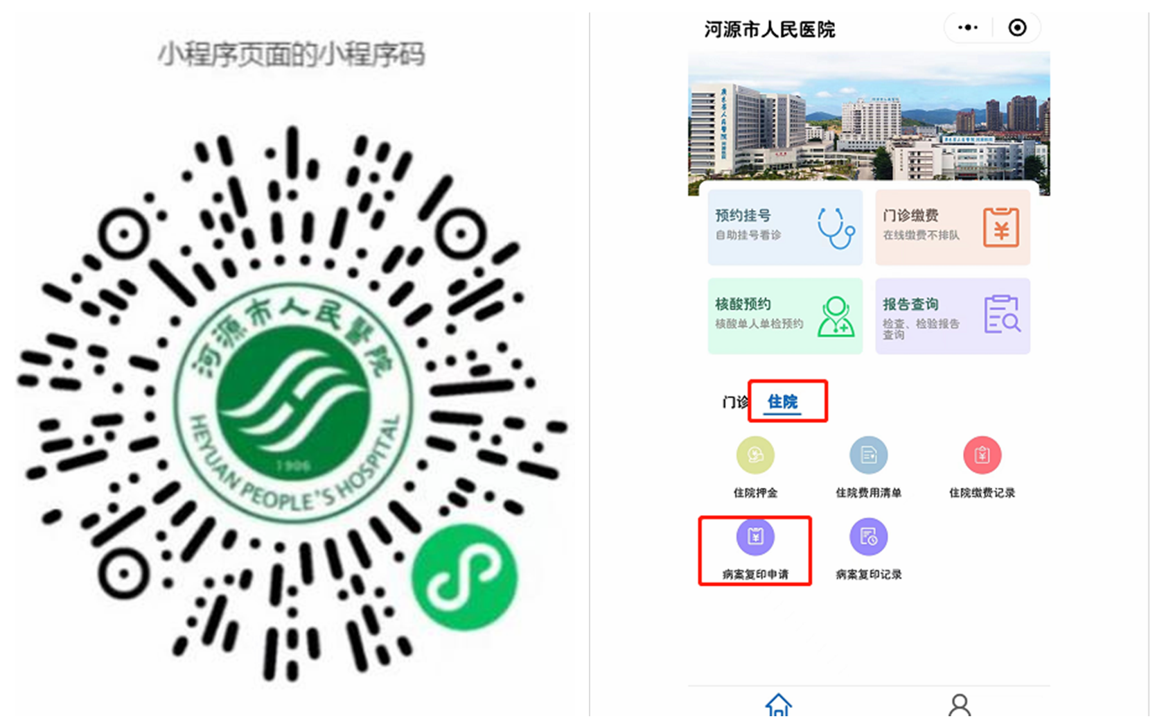 1、微信扫码或微信关注 “河源市人民医院”小程序,选择“住院”模块,点击“病案复印申请”。