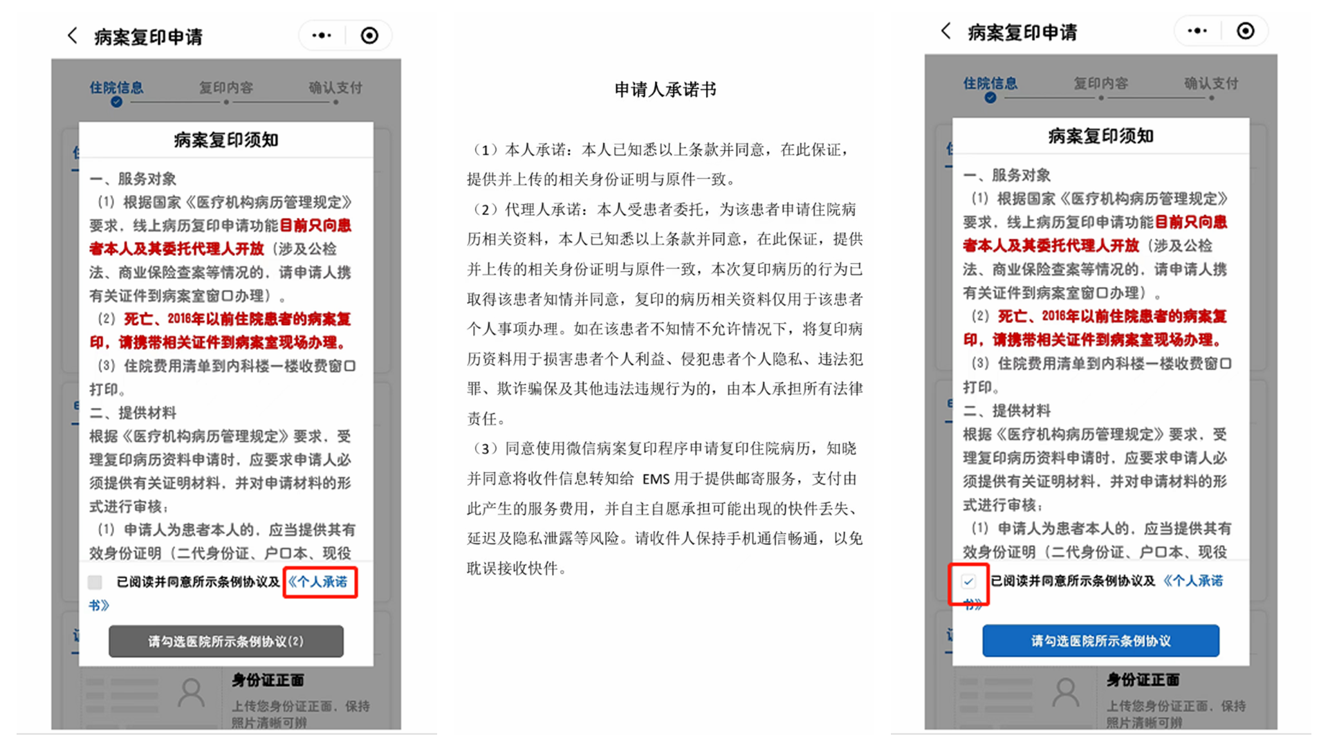 2、点击阅读“病案复印须知”及《个人承诺书》,勾选“□已阅读并同意所示条例协议”。
