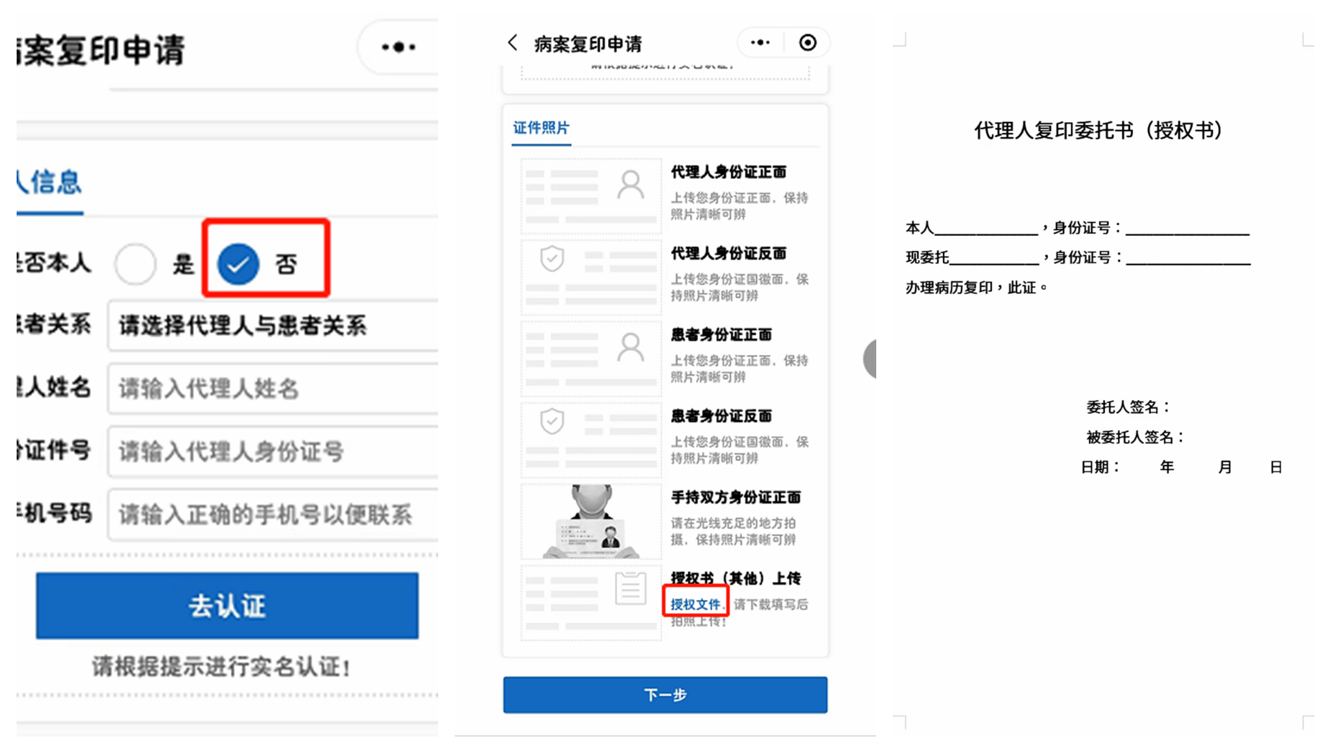 (2)患者授权代理人:填写与患者关系、姓名、身份证号码和手机号码,完成实名认证后按要求上传证件照片,并上传授权委托书(点击“授权文件”可查看委托书模板,手写模板后需患者本人亲笔签名及加盖手印)。