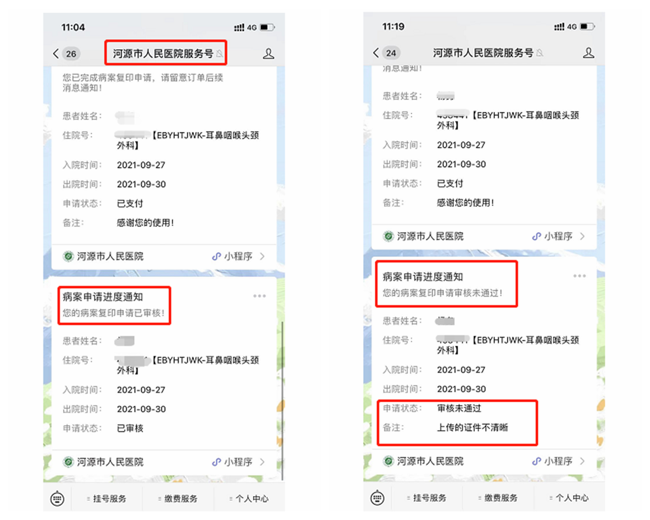 6、待医院管理员审核通过后,申请人会在“河源市人民医院服务号”中收到推送消息,等待医院邮寄即可;若后续审核不通过,申请人根据医院管理员反馈的“备注”栏信息重新申请即可。
