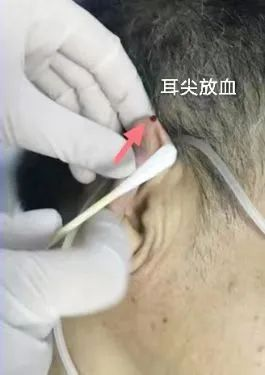 2.耳尖刺络放血:取单侧耳尖穴,经碘伏或酒精消毒后,持一次性采血针迅速刺入约1-2mm深,随即出针,轻压针孔周围的耳廓,使其自然出血,然后用酒精棉球吸取血滴。适用范围:面瘫、失眠、发热、高血压、癫痫、精神狂躁症等。