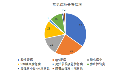 近年来,肾内科通过肾穿刺活检术明确诊断的肾脏病理诊断常见病种占比排名:以膜性肾病(35%)、IgA肾病(23%)、肾病综合征-微小病变型(14%)、2型糖尿病性肾病(14%)等肾病科常见病、多发病为主,同时也有越来越多的罕见病、少见病得到确诊,常见病种分布情况见下图:
