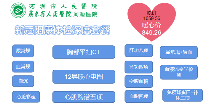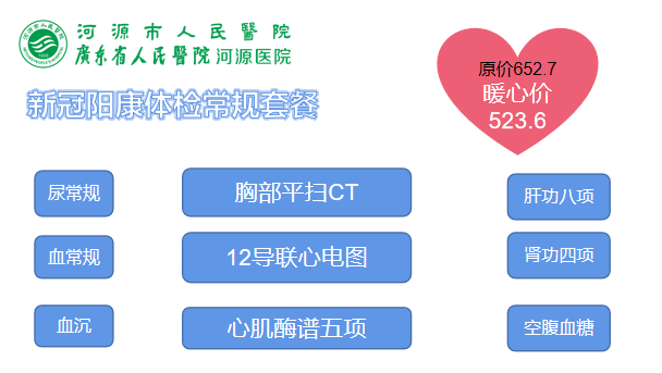 “阳康”优惠体检套餐介绍针对新冠病毒感染后可能导致的健康隐患,我院体检中心推出了以下两种体检优惠套餐。包含了血尿常规、肝肾功能、胸部平扫CT、心肌酶谱、心电图、心脏彩超、炎症免疫指标等核心项目,使新冠病毒感染者“阳康”后可以对自己的健康状况有直观的评估,体检后有专业的医生进行解读,为您和家人的健康保驾护航。