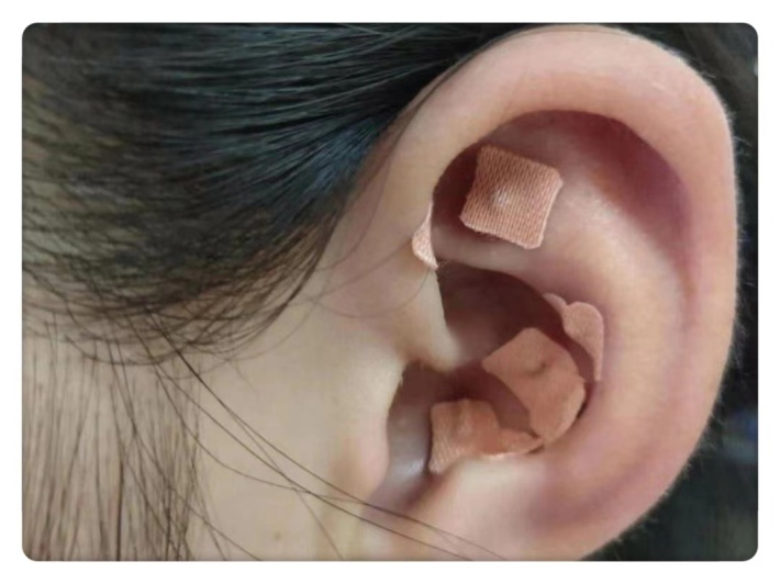 耳穴压豆是将贴有王不留行籽的耳穴贴敷于相应耳穴并稍加压力,以穴位产生酸麻胀感或发热为度。贴敷后每天自行按压数次,每次15-20分钟,保留2-3天取下即可,一般5次为1个疗程。