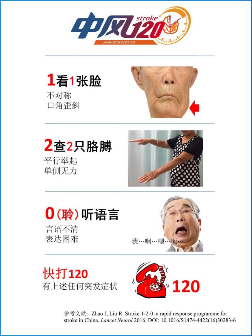 1——看1张脸,看是否不对称,有无口角歪斜(“1”代表看到1张不对称的脸)2——查2只胳膊,平行举起看有无单侧无力,有一只胳膊落下来(“2”代表存在单侧肢体无力的症状)0——聆(0)听语言,说一句完整的句子,例如今天天气晴朗,看是否有言语不清,表达困难的情况(“0”为聆的谐音,代表“聆听讲话是否清晰”)