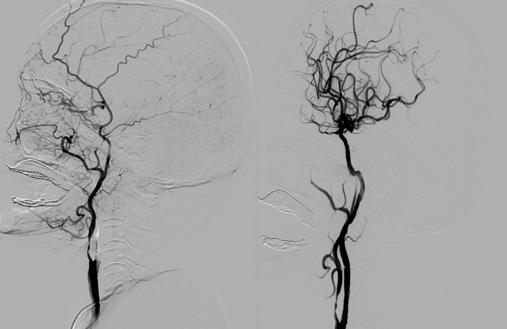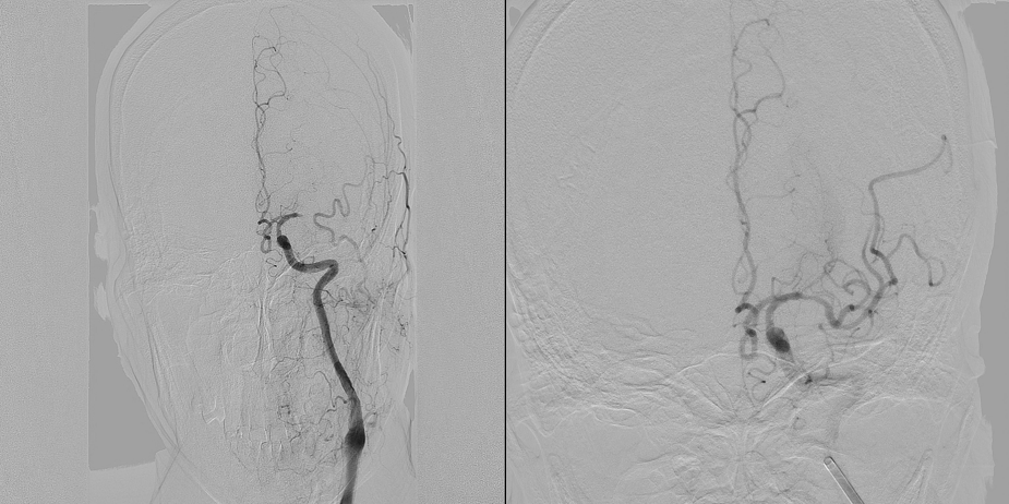 急诊取栓术前右侧颈总动脉造影(左)、急诊取栓术后右侧颈总动脉造影(右)