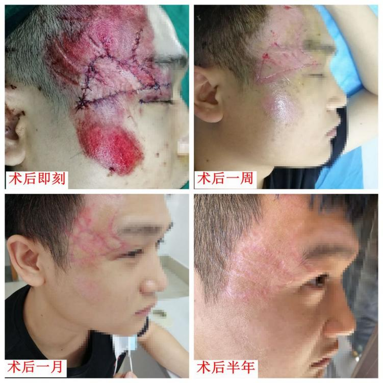 患者为23岁男性,因“车祸受伤5小时”到我院急诊就诊,急诊拟“面部皮肤挫裂伤伴缺损”收住烧伤整形和创面修复外科,在积极完善术前检查,排除手术禁忌症。赖春晖主任仔细查看患者伤情,患者存在右侧面神经颞支损伤,皮肤挫伤,并伴有明显的缺损。告知其患者及家属手术指征明确,考虑其青年未婚男性,普通清创缝合后期存在较明显疤痕,且伤口位于明显部位,后期给患者的心理及外观带来极大的影响。赖春晖主任经慎重考虑后决定在全麻下行“右额颞部外伤清创整形术+右外眦成形术+局部皮瓣转移修复术”,术中进行创面彻底清创、皮瓣修复、伤口美容缝合及后期瘢痕预防,最大程度的减轻后期瘢痕增生。术后患者面神经损伤逐渐恢复,半年后面部无明显瘢痕增生,伤口愈合良好。