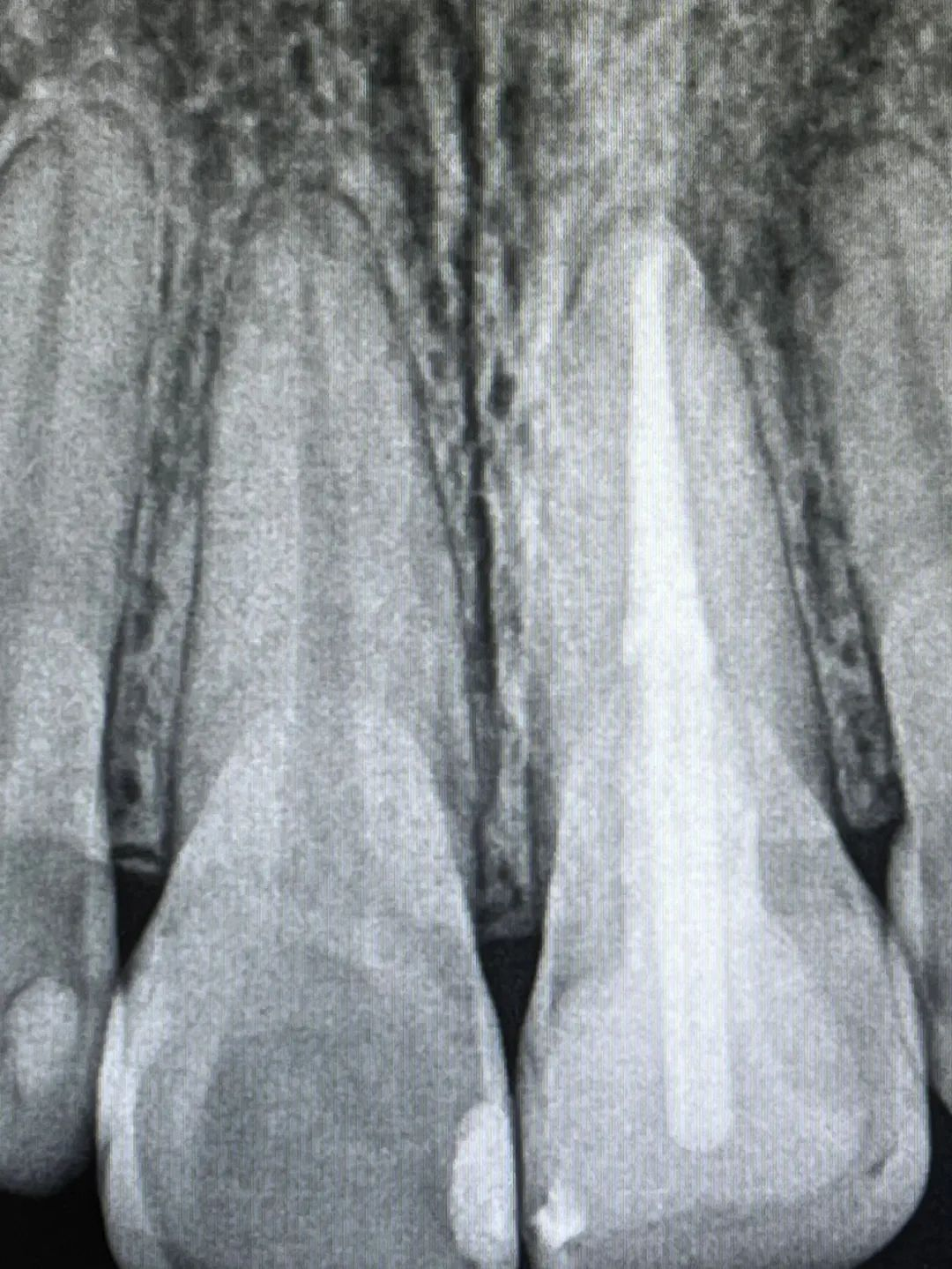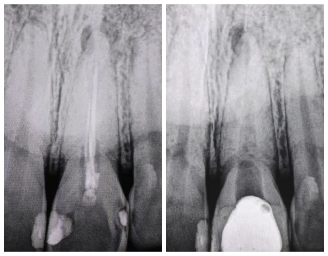 陈某,28岁,3年前因左上前牙因龋坏严重在外口腔门诊就诊后被告知龋坏严重需“根管治疗”,治疗后行树脂充填修复,期间无不适,近1年来发现患牙变色严重、未及时处理,愈发严重,现前来我院口腔科就诊。经完善口腔检查后发现21号牙着色严重,舌侧窝、近远中边缘嵴均有牙色充填体,打开后发现牙体髓腔内有大量腐质和污染的充填物;X线根尖片显示近远中、舌侧窝有充填体洞底暗影明显,根管内充填物不密实和不到位、根尖区阴影4×4mm。诊断为:21慢性根尖周炎、内源性着色牙、继发龋、牙体缺损。治疗计划:①21根管再治疗+内漂白术+纤维桩+复合树脂充填;②21根管再治疗+内漂白术+纤维桩树脂核+全瓷冠修复;③21根管再治疗+内漂白术+纤维桩树脂核+瓷贴面修复。知情同意后患者先选择方案①。经过6次显微诊疗后着色牙里里外外都变动非常干净,颜色也逐渐恢复到与邻牙接近,经5个月的随访根尖区的炎症也基本消退。