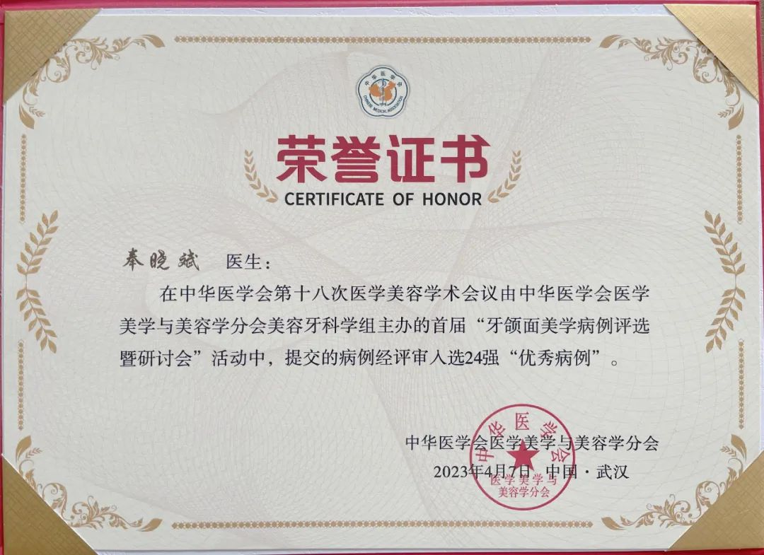 【喜讯】口腔科荣获中华医学会牙颌面美学病例大赛“价值病例”奖