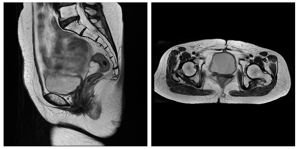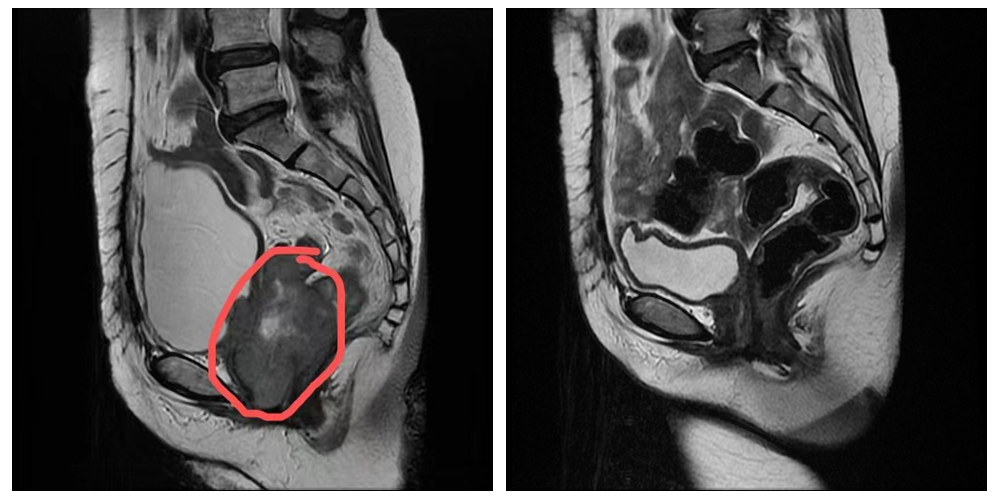 治疗前盆腔磁共振及复查盆腔磁共振:肿瘤已消失