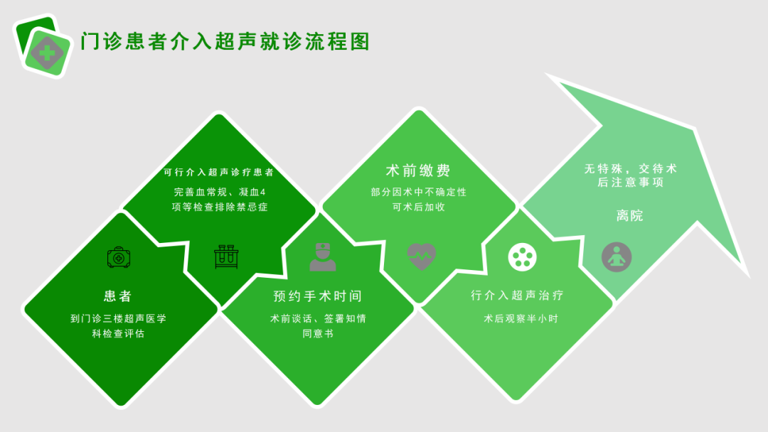 1.门诊病人:到超声医学科检查评估-可行介入超声诊疗患者-完善血常规、凝血四项等检查排除禁忌症-预约手术时间-术前谈话、签署知情同意书-术前缴费(部分因术中不确定性可术后加收)-行介入超声治疗-术后观察半小时-无特殊,交代术后注意事项-离院。