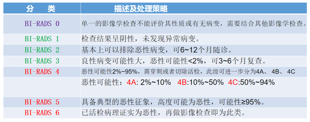 那么,什么是乳腺癌风险等级?我们经常在检查报告上看到的BI-RADS 0~6 的一串数字代表什么?以下表格和我们讲述乳腺超声BI-RADS分类及处理策略。